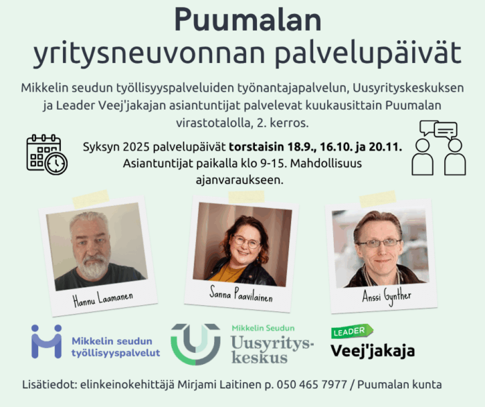 Puumalan syksyn 2025 yritysneuvonnan palvelupäivät ovat torstaisin 18.9., 16.10. ja 20.11.