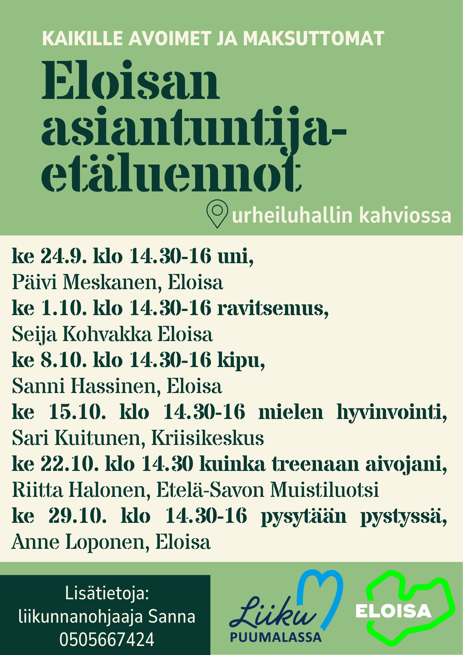 Puumalassa nämä näytetään urheiluhallin kahviossa paikan päällä. Voit osallistua yhdelle tai useammalle mielenkiintoiselle luennolle. Luennot ovat osa senioreiden elintapaohjausryhmää, mutta ne ovat avoimia myös ryhmän ulkopuolisille henkilöille. Myös elintapaohjausryhmään ehtii vielä mukaan pikalähdöllä tämän vk 39 ajan ottamalla yhteyttä Liikunnanohjaaja Sanna Puumala