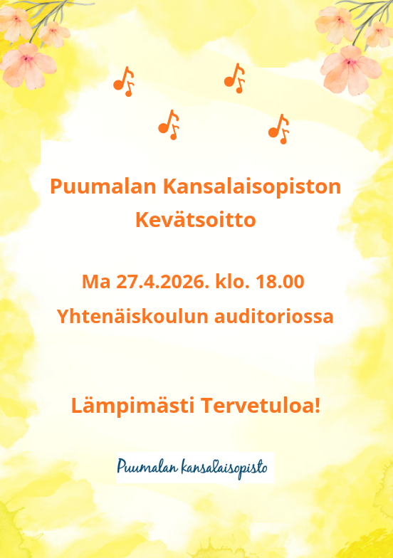 « Kaikki TapahtumatKansalaisopiston kevätsoitto27.04 | 18:00 - 20:00.« Kino SaimaaMetsäsydämen joogapäivät »Olet lämpimästi tervetullut kuuntelemaan Puumalan kansalaisopiston kevätsoittoa. Vapaa pääsy! Paluu