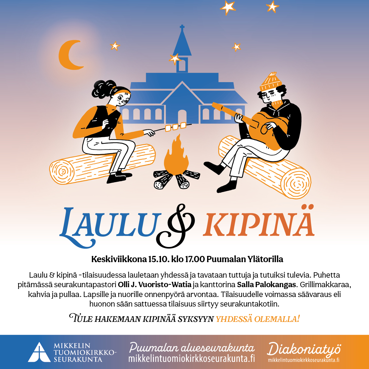 Ke 15.10 klo 17 Puumalan Ylätorilla Laulu & kipinä. Lauletaan yhdessä, paistetaan makkaraa ja tavataan tuttuja ja tutuiksi tulevia. Puhetta pitämässä Olli J. Vuoristo-Watia. Tule hakemaan kipinää syksyyn yhdessä olemalla! (Säävaraus, huonon sään sattuessa tilaisuus seurakuntakodissa)