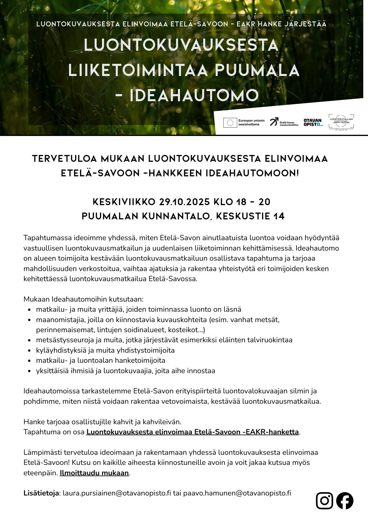 Tervetuloa mukaan Luontokuvauksesta elinvoimaa Etelä-Savoon -hankkeen ideahautomoon!