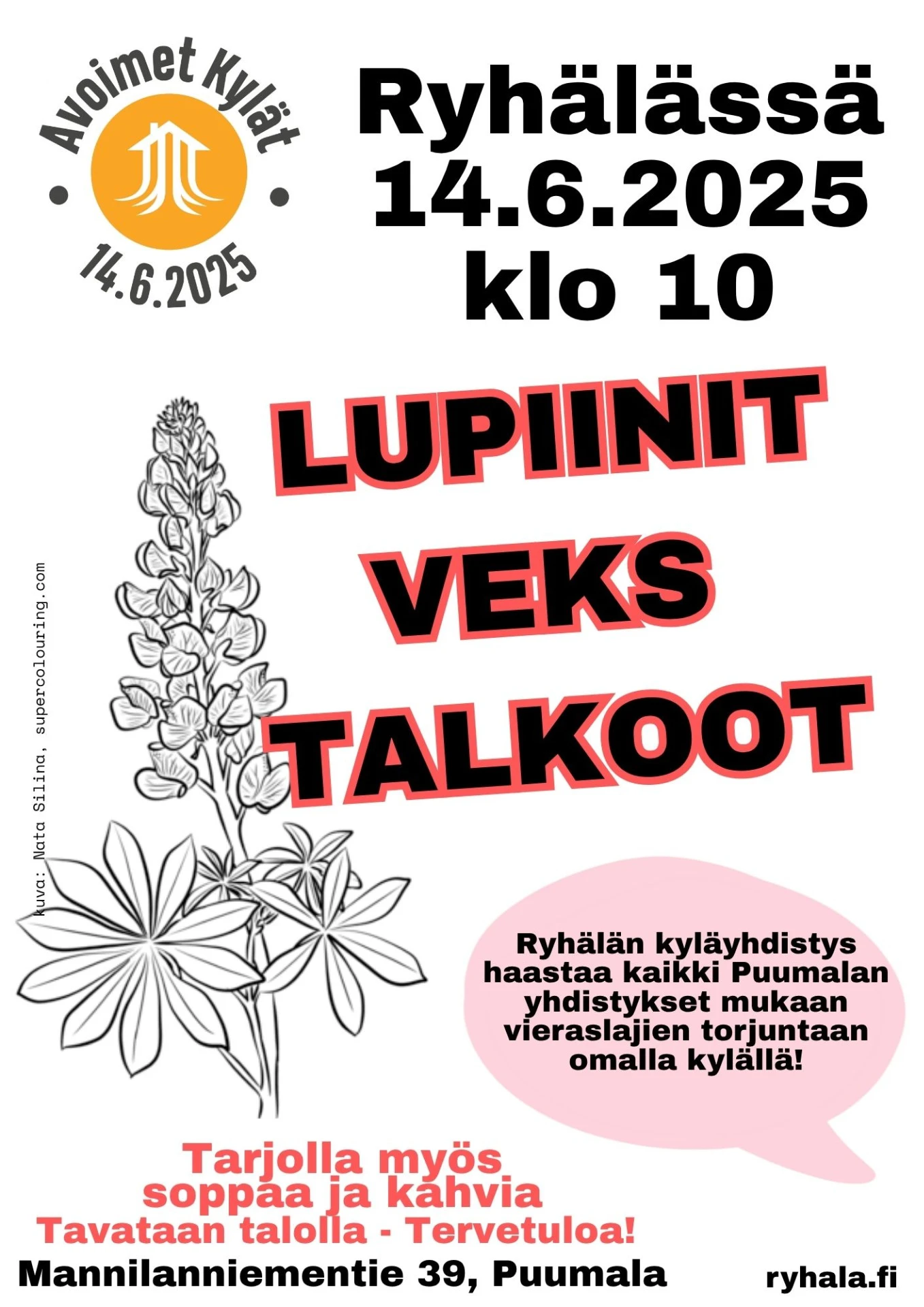 Talkoohommana on tällä kertaa erityisesti lupiinien torjunta kylän keskeisellä paikalla. Talkoopäivänä töitä on myös talolla mm. keittiössä ja siivouksessa, joten hommaa riittää kaikille ja osallistua voi päivän aikana omien voimien ja aikataulun mukaan.