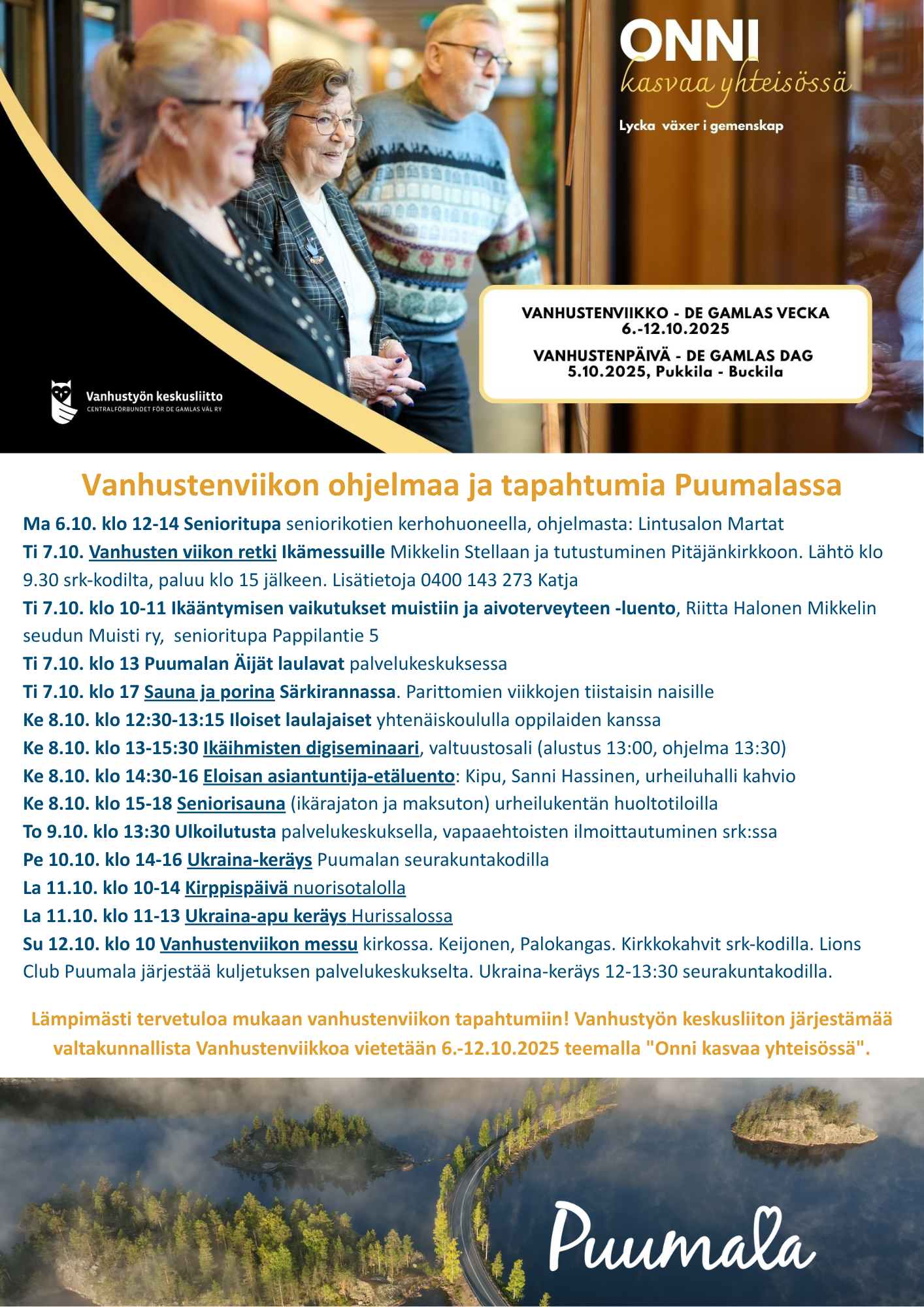 Su 12.10. klo 10 Vanhustenviikon messu kirkossa. Keijonen, Palokangas. Kirkkokahvit srk-kodilla. Lions Club Puumala järjestää kuljetuksen palvelukeskukselta. Ukraina-keräys vanhusten kirkkopyhän jälkeen klo 12-13.30.