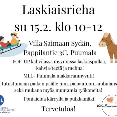 tapahtumat-2 Tapahtumat 01.01. - 31.12. Puumalan tapahtumakalenteri 2026 06.01. - 31.12. Kino Saimaa 06.01. - 31.12. Puumalan alueseurakunnan tapahtumat 08.01. - 30.04. Avantouintisaunat ja seniorisaunat 31.01. - 23.05. Joogatunnit Hurissalon kylätalolla 03.02. Ilta puumalalaisille yhdistyksille 14.02. - 30.12. Metsäsydämen joogapäivät 14.02. Ukraina-apu keräys Hurissalossa 15.02. Laskiaisrieha 24.02. Norppaopisto -luento Auditoriossa 10.07. - 11.07. Rantakekkerit 10.07. - 12.07. Saimaa Cycle Tour