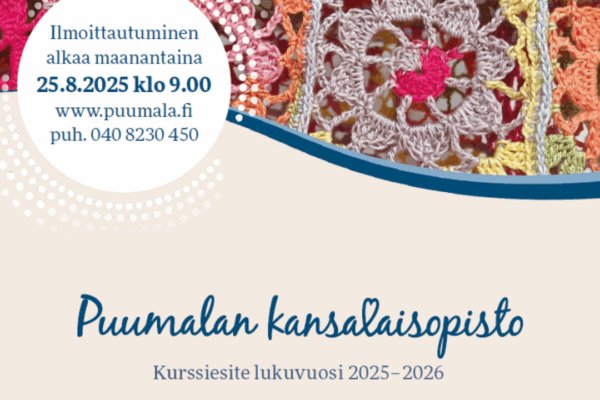 Puumalan kansalaisopiston kurssiesite on julkaistu! Ilmoittautuminen Puumalan kansalaisopiston syyslukukaudelle 2025 avautuu maanantaina 25.8.2025 klo 9.00. Lisätietoja ilmoittautumisesta Kansalaisopiston sivulla. Voit ladata …