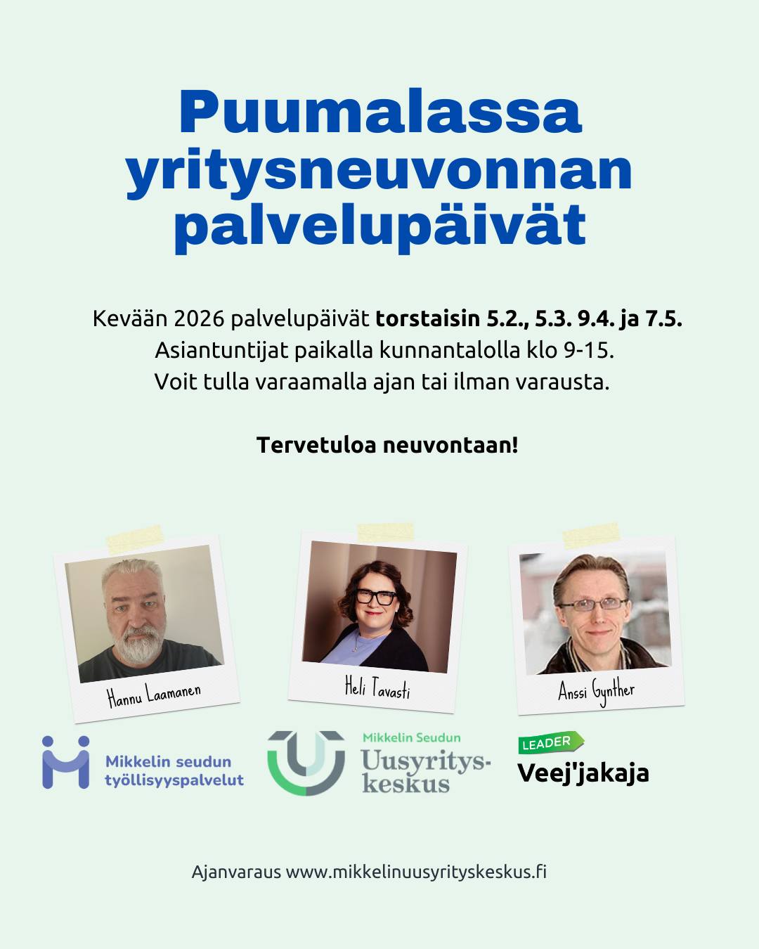 Yritysneuvonnan palvelupäivät Puumalassa keväällä 2026 torstaisin 5.2., 5.3., 9.4. ja 7.5.
